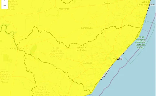 O Instituto Nacional de Meteorologia (Inmet) renovou o alerta amarelo para todo o estado de Alagoas, com previsão de chuvas intensas e ventos de até 60 km/h até as 23h59 desta terça-feira (7).