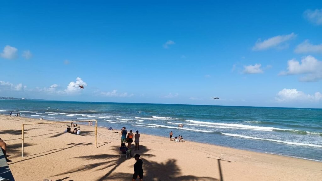 A operação conta com cinco militares, sendo três atuando dentro do mar e dois na faixa de areia, além do apoio de duas aeronaves do Departamento Estadual de Aviação (DEA).