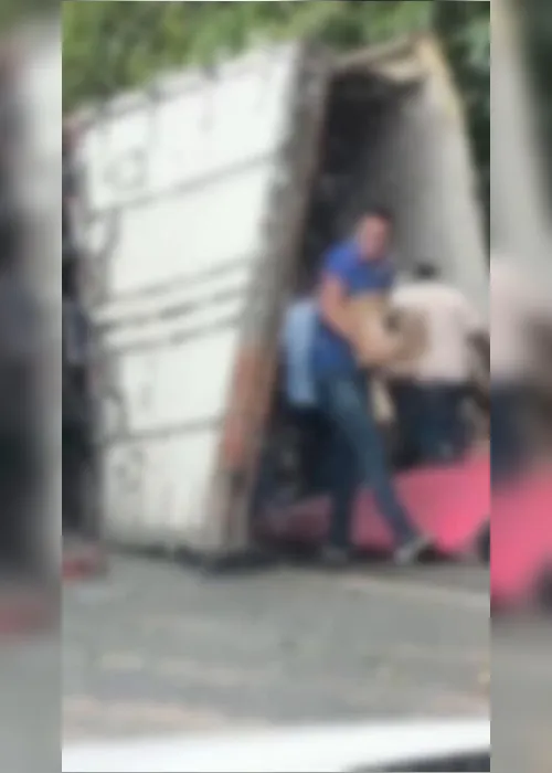 Após o acidente, populares saquearam a carga, retirando pacotes e caixas tanto do baú do veículo quanto do acostamento.