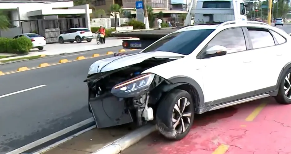 O veículo perdeu o controle, colidiu com um separador de concreto, rodou e parou sobre a calçada após invadir a ciclofaixa.