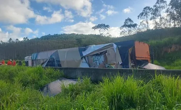 Carreta tomba na BR-101 em Messias, deixa casal ferido e carga saqueada