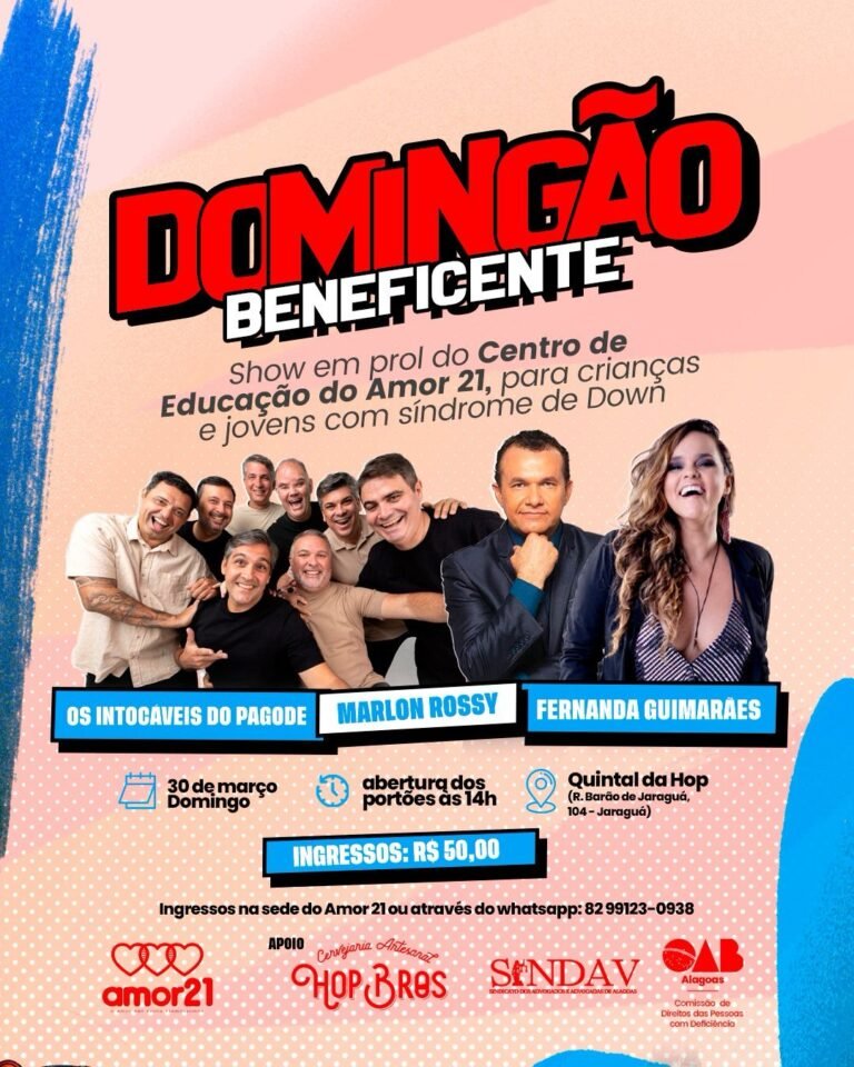 Por Redação com assessoria Fernanda Guimarães, Os Intocáveis do Pagode e Marlon Rossy já estão confirmados Encerrando as atividades alusivas ao Mês da síndrome de Down, o Instituto Amor 21 fará o “Domingão Beneficente”, um show solidário no dia 30