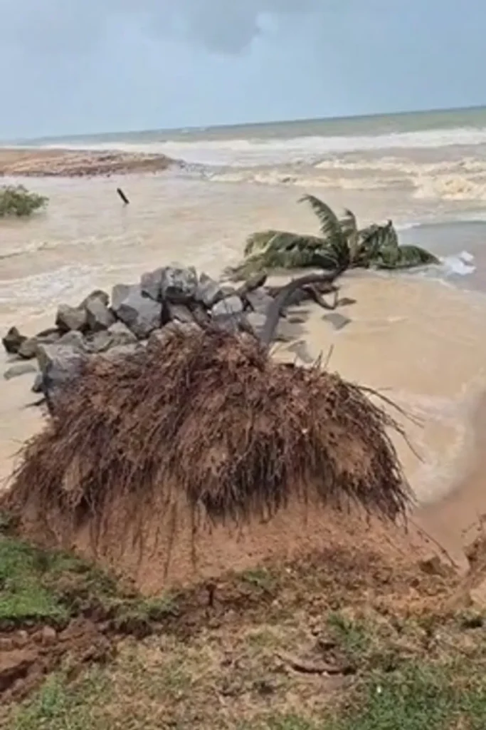 Um coqueiro de grande porte caiu na manhã desta segunda-feira (19) na Praia de Jacarecica, em Maceió, devido às fortes chuvas e à maré alta que avançou sobre a faixa de areia.