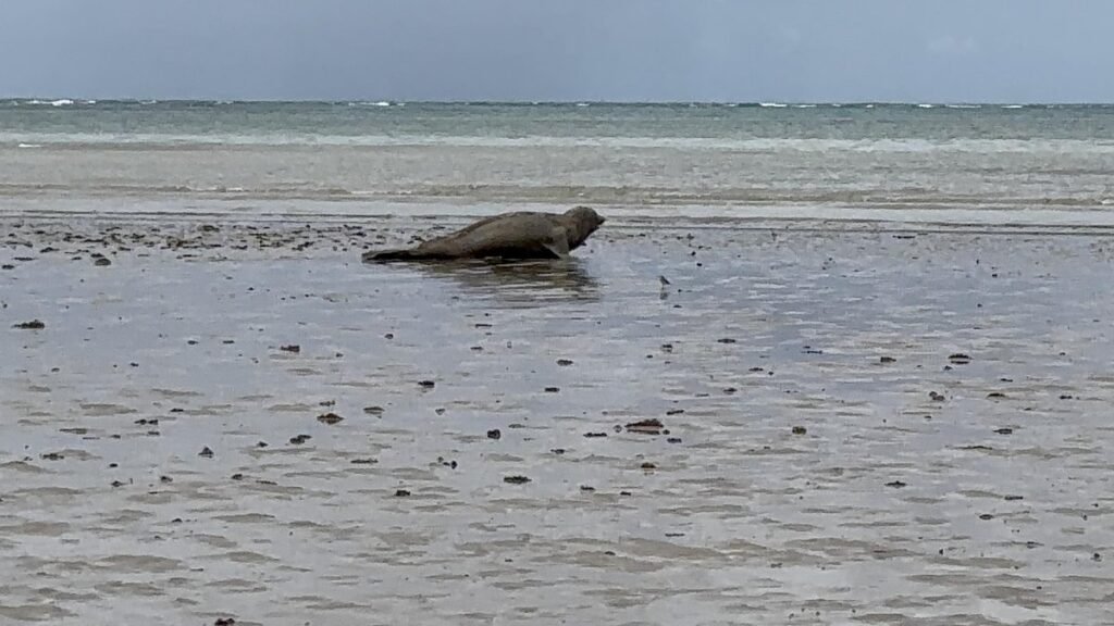 Considerado jovem, com cerca de 2 metros e meia tonelada, ele passa por um processo natural de troca de pele, período em que fica mais debilitado e busca descanso na costa.