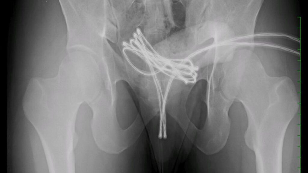 Exames de imagem revelaram que o cabo havia sido empurrado até a bexiga do paciente, complicando o procedimento de remoção. O estudante relatou aos médicos que anteriormente já havia introduzido outros objetos, como cotonetes e cabos de arame, com o mesmo propósito.
