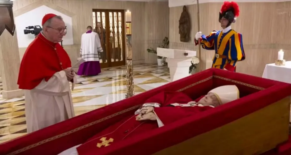 Em um caixão simples de madeira com forro vermelho, o corpo do Papa Francisco repousa, vestido em uma casula (veste solene usada por presbíteros e bispos) também da cor vermelha.