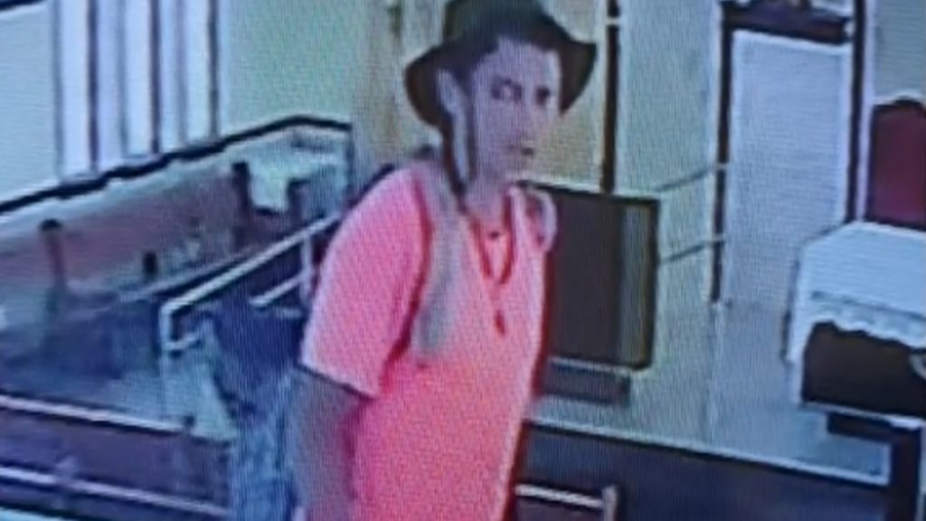 Imagens de câmeras de segurança mostram o suspeito circulando pelo interior da igreja, observando o local e saindo tranquilamente com o objeto. O homem usava calça jeans, camisa rosa e chapéu no momento do crime.