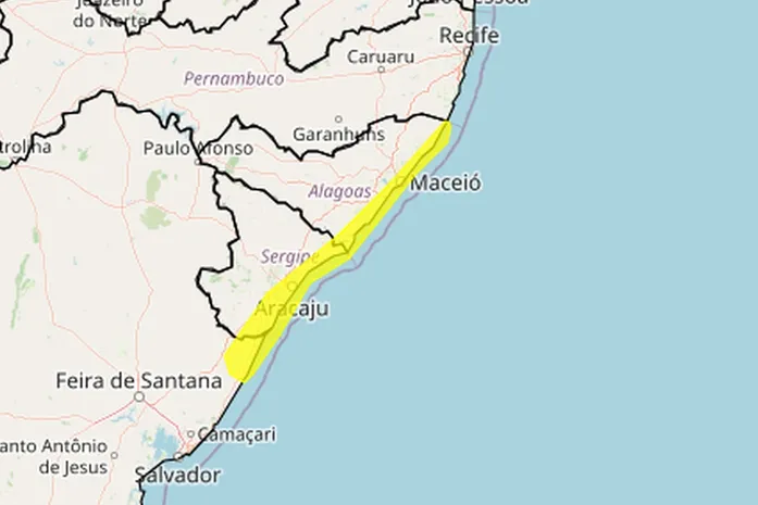 O Instituto Nacional de Meteorologia (INMET) emitiu nesta segunda-feira (2) um alerta laranja de chuvas intensas para 21 cidades do Litoral de Alagoas. O aviso é válido até as 10h desta terça-feira (3).