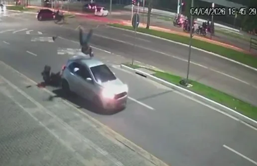 Imagens de videomonitoramento flagraram o momento em que um motociclista de 29 anos foi arremessado após colidir com um carro no bairro Jardim Petrópolis, em Maceió. O acidente ocorreu no último sábado (4).