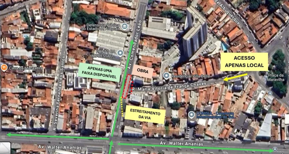 A Avenida Comendador Leão, no bairro Poço, em Maceió, está interditada durante a noite devido a uma obra emergencial da BRK para reparo na rede de esgoto. Os serviços começaram na quinta-feira (3) e devem seguir até o dia 6 de julho, podendo se estender em caso de chuvas.