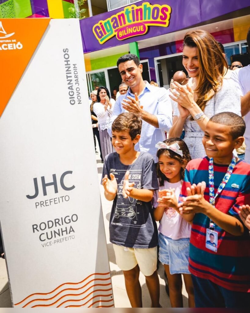 Na manhã desta quinta-feira (19), o prefeito JHC, ao lado da primeira-dama Marina Candia e do vice-prefeito e secretário de Infraestrutura Rodrigo Cunha, inaugurou mais uma unidade do programa Gigantinhos na parte alta de Maceió. A nova escola está localizada no bairro Cidade Universitária, no Conjunto Novo Jardim.