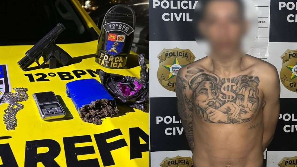 O suspeito foi encaminhado à Central de Flagrantes e autuado por posse irregular de arma de fogo e tráfico de drogas.