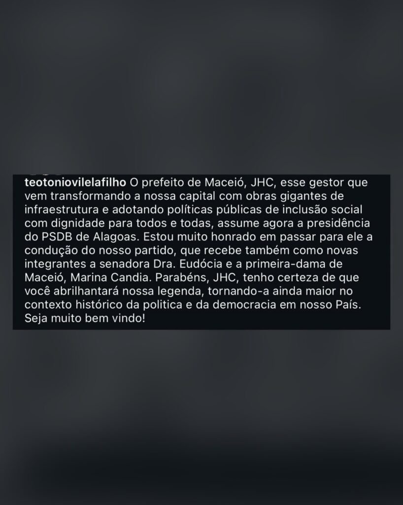 O ex-governador Teotonio Vilela Filho anunciou a transferência da presidência do PSDB em Alagoas para o prefeito de Maceió, JHC. A decisão foi divulgada nas redes sociais, acompanhada de uma mensagem de confiança na nova liderança.